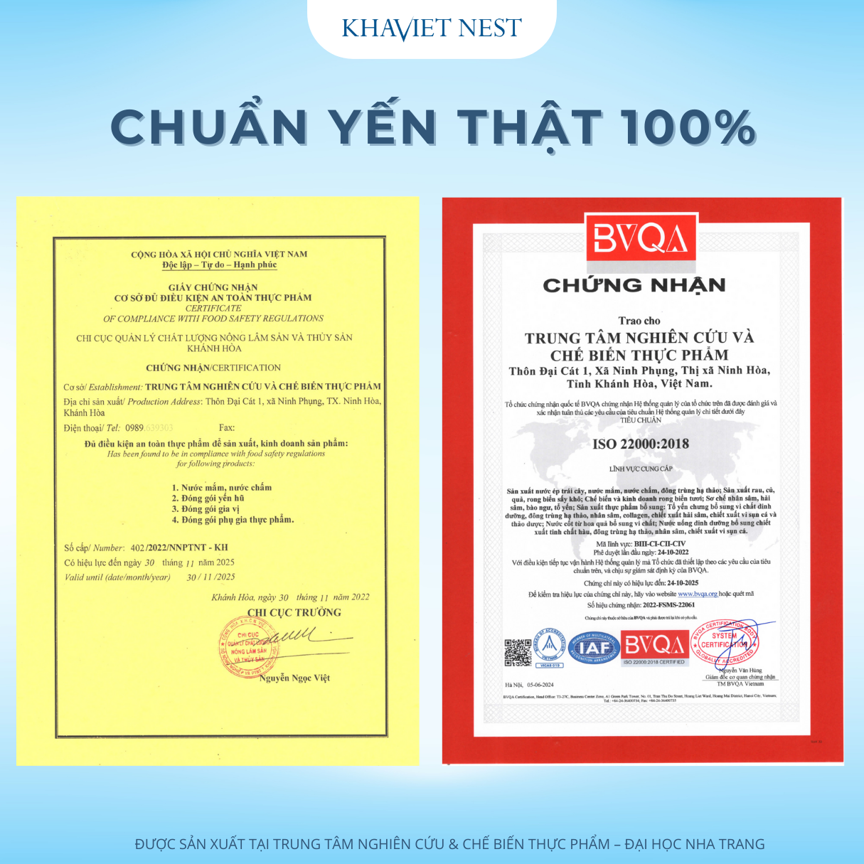 Khaviet Nest cam kết chỉ sử dụng 100% tổ yến nguyên chất từ Khánh Hòa, khai thác đúng thời điểm để đảm bảo giá trị dinh dưỡng cao nhất. Mỗi sản phẩm của chúng tôi đều có nguồn gốc rõ ràng, trải qua quy trình kiểm định nghiêm ngặt trước khi đến tay khách hàng. Tất cả sản phẩm đều được chế biến tại Trung tâm Nghiên cứu & Chế biến Thực phẩm – Đại học Nha Trang.